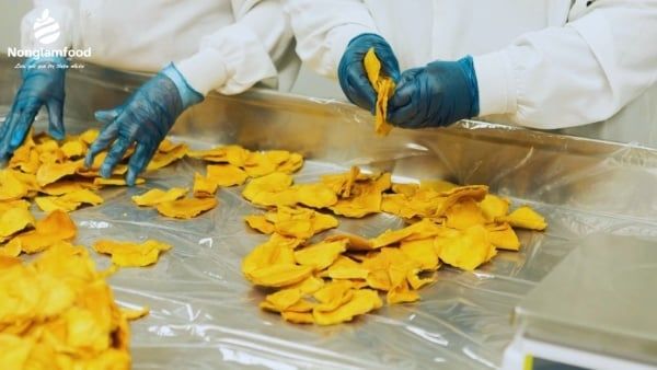 Trái cây được rửa sạch, gọt vỏ, bỏ hạt và cắt lát theo kích thước tiêu chuẩn. Lát cắt đều giúp quá trình sấy diễn ra đồng nhất, tránh tình trạng miếng quá khô hoặc quá ẩm sau sấy.