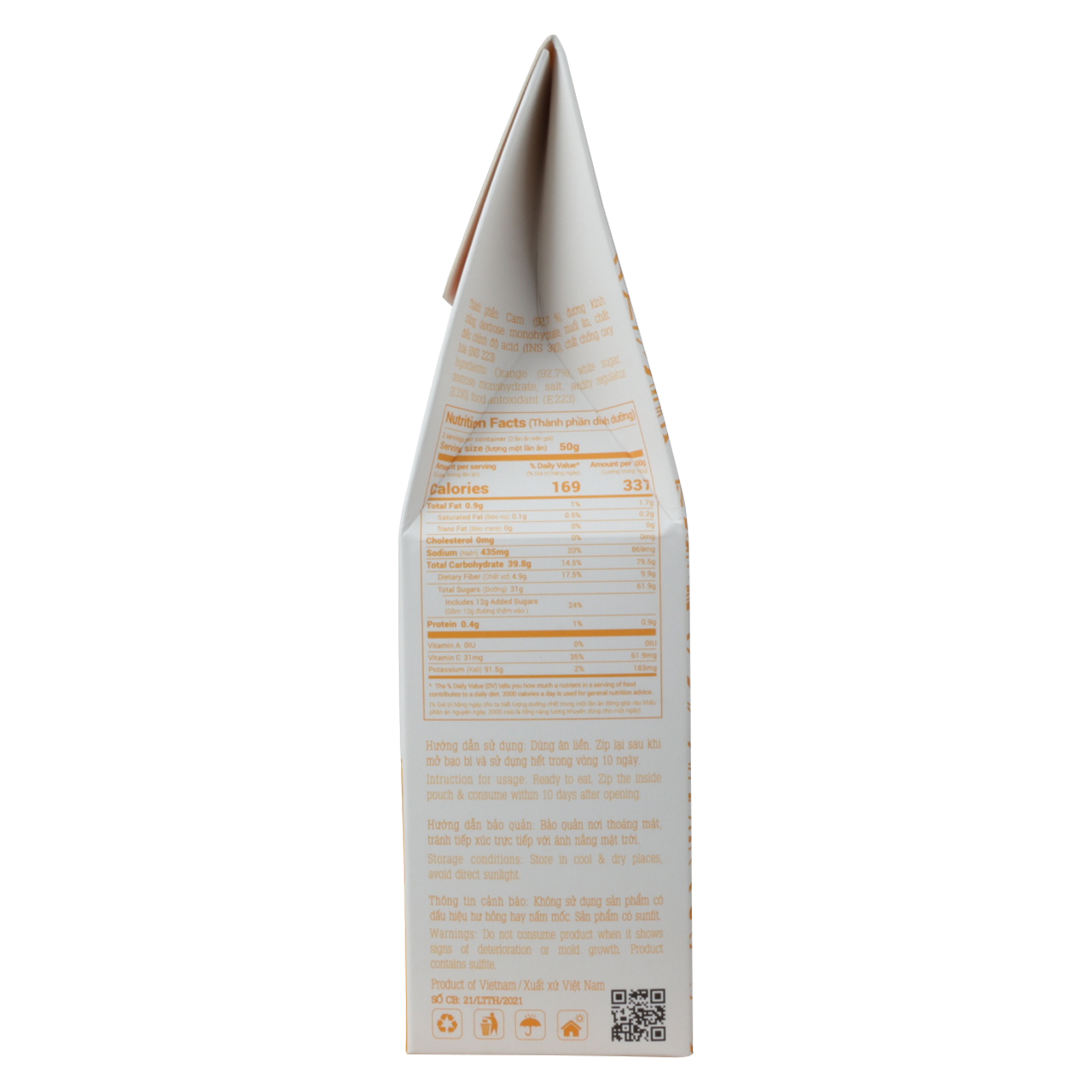 Thành phần: Cam (92.7%), đường kính trắng, dextrose monohydrate, muối ăn, chất điều chỉnh độ acid (INS 330), chất chống oxy hoá (INS 223).