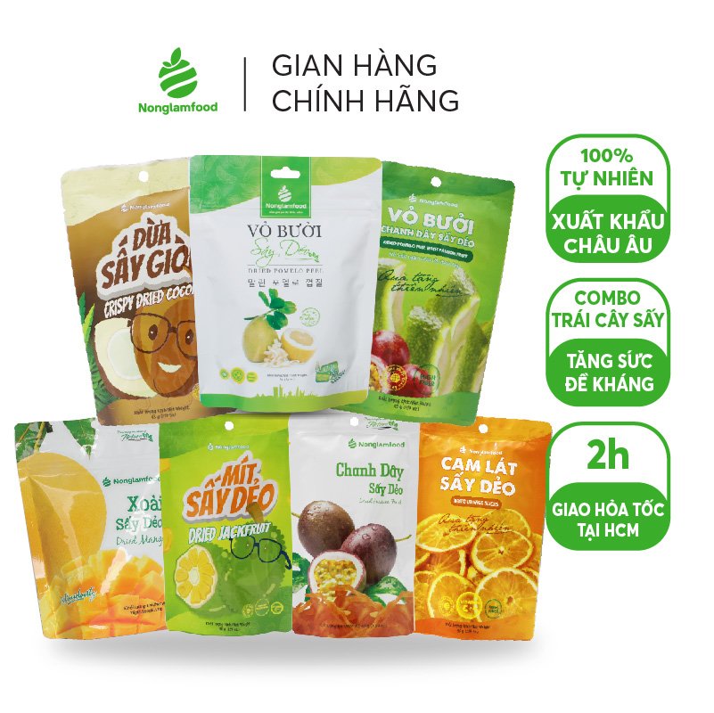 Combo 7 loại trái cây sấy gồm: Mít Sấy Dẻo 45g, Cam lát sấy dẻo 45g, Dừa Sấy Giòn 45g, Vỏ Bưởi Chanh Dây 45g, Xoài Sấy Dẻo 75g, Vỏ Bưởi Sấy Dẻo 85g, Chanh Dây Sấy Dẻo 45g