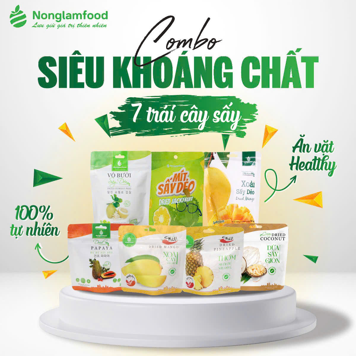 Bạn đang tìm kiếm một món ăn vặt vừa ngon miệng, vừa tốt cho sức khỏe? Combo "Siêu Khoáng Chất – 7 Trái Cây Sấy" từ Nonglamfood chính là lựa chọn hoàn hảo cho gia đình, dân văn phòng, người tập thể dục hay làm quà tặng ý nghĩa.