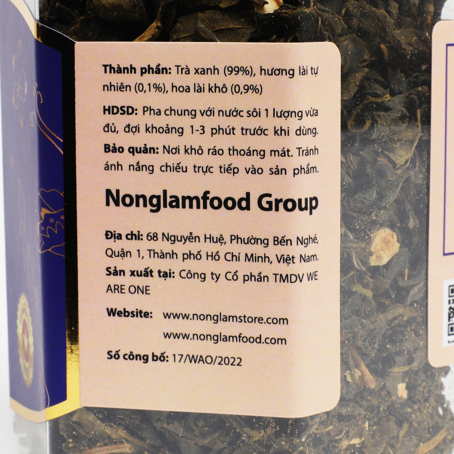 Thành phần: Trà xanh (99%), hương lài tự nhiên (0,1%), hoa lài khô (0,9%)
